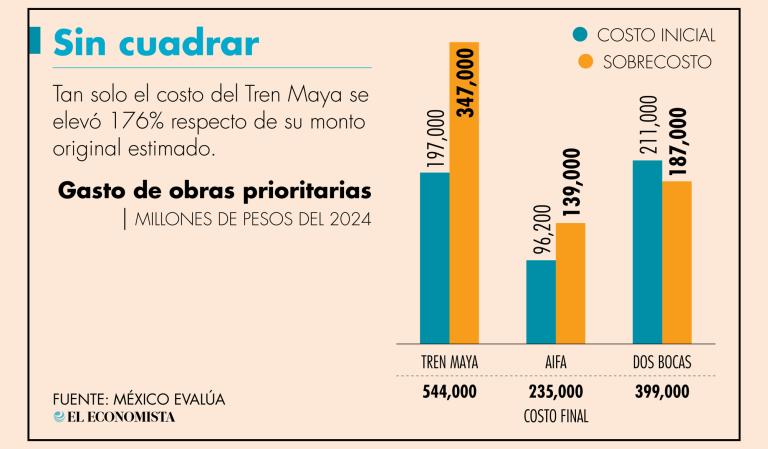 Las obras insignia que se impulsaron en el sexenio pasado, como el Tren Maya, la Refinería Dos Bocas y el Aeropuerto Internacional Felipe Ángeles (AIFA), tuvieron un sobrecosto significativo en su ya millonario presupuesto, de acuerdo con los cálculos de la organización México Evalúa.