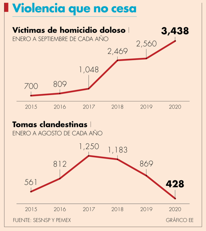 No obstante, el delito repuntó en el mes de agosto del 2020. Y es que, de acuerdo con las cifras de Pemex, para ese mes —cuando se detuvo al Marro—, se contabilizaron un total de 80 tomas clandestinas, la cifra más alta de lo que va del año. Un mes antes, en julio, se registraron 43.